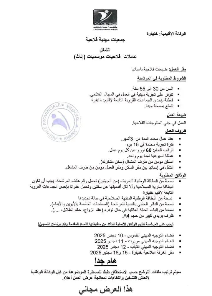 🌟 فرصة العمر: برنامج عاملات موسميات بإسبانيا 2025/2026 عبر أنابيك خنيفرة 👩‍🌾