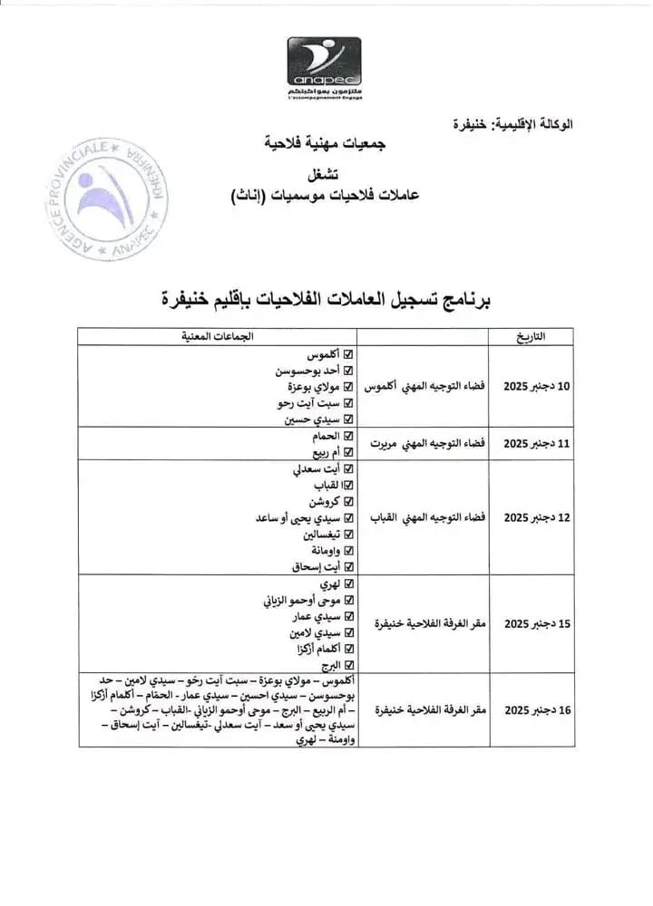 تدعو أنابيك خنيفرة المرشحات المؤهلات إلى زيارة مراكز التسجيل المحددة وفق الجدول التالي: